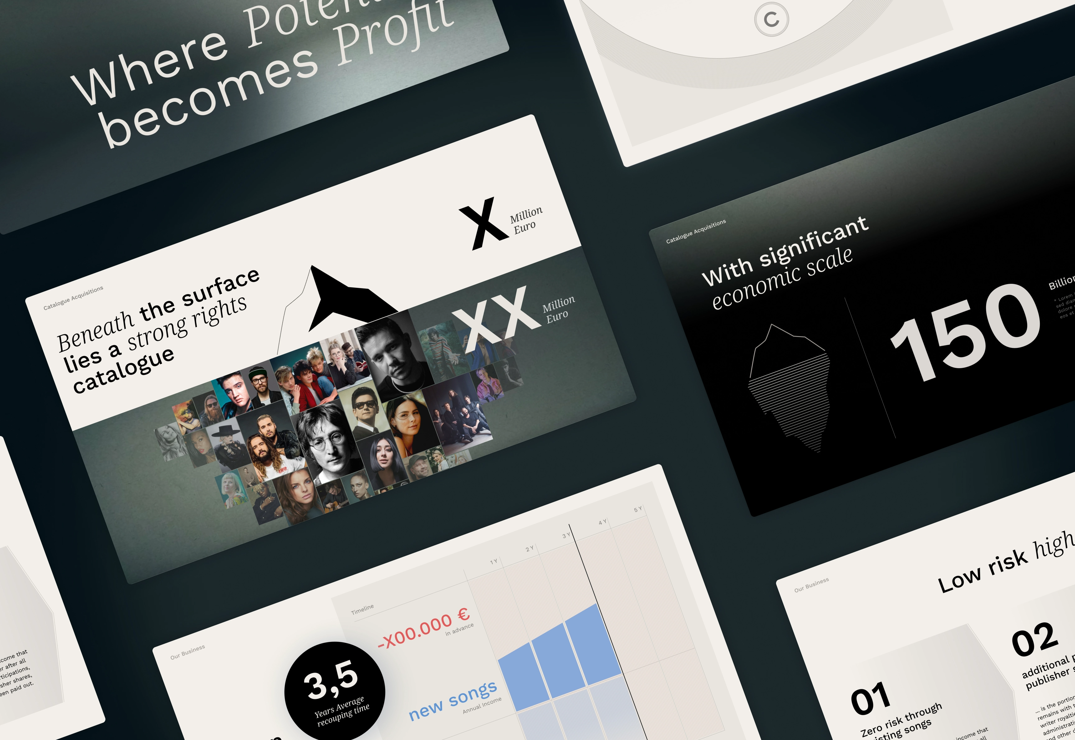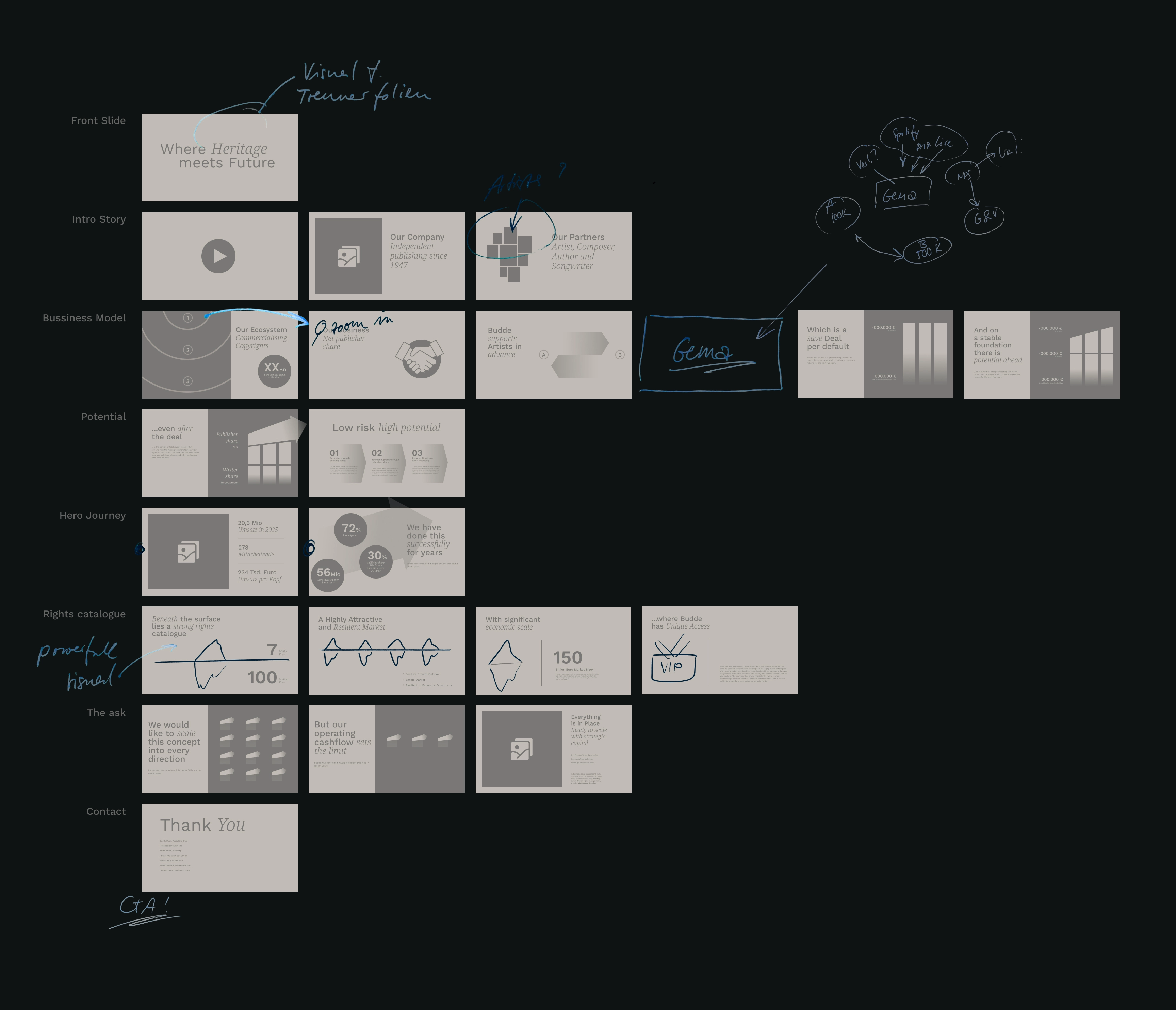Für BuddeMusic habe ich ein Investor-Pitch-Deck gestaltet und konzeptionell mitentwickelt, das ihr komplexes Geschäftsmodell rund um Musiklizenzierung klar und überzeugend vermittelt. Ziel war es, Inhalte so zu strukturieren und visuell aufzubereiten, dass branchenfremde Investor:innen und Banken das Modell schnell erfassen und die zentralen Vorteile unmittelbar erkennen. Durch eine stringente Storyline, präzise Visualisierungen und eine hochwertige Designsprache wurden Chancen, Differenzierung und Potenzial so kommuniziert, dass die Präsentation Entscheidungsträger gezielt in Richtung Investment führt.